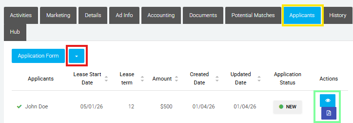 You can access submitted applications through the Listing Record page by clicking the 'Applicants' tab pictured below in yellow.
