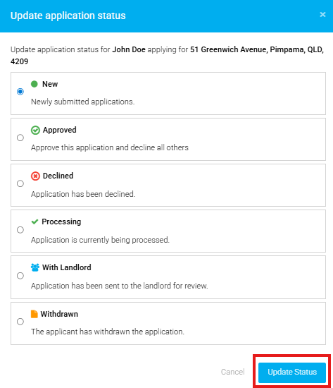 If you want to change the status of the application (e.g. processing, approved), you will click the Application Status box to change as pictured below: