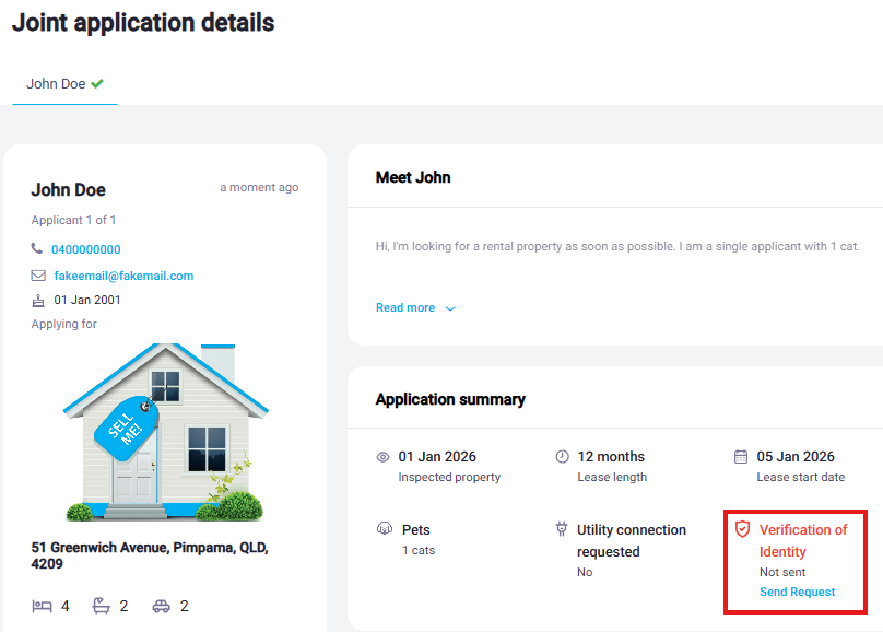 After clicking the eye icon to open the application for processing, it will open all of the information submitted by the prospective tenant/s. To send the applicants an identity verification request, please click 'Send Request' outlined in the red box below:
