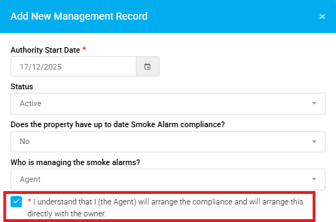 When creating the management record, you will tick the below box acknowledging that you will be arranging the smoke alarm compliance as per legislative requirements.