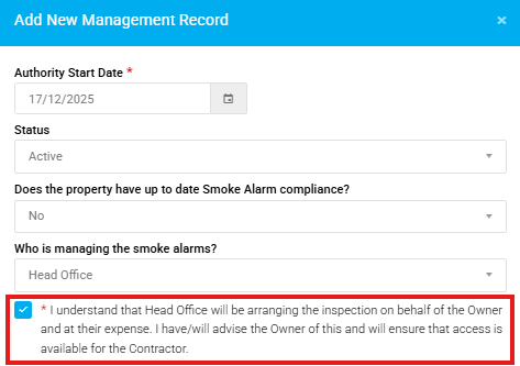 When creating the management record, you will tick the below box acknowledging that Head Office will be arranging the smoke alarm compliance as per legislative requirements.