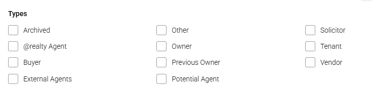 Below is a list of Types that can be used for your contacts. It is important that every contact has a type added.
