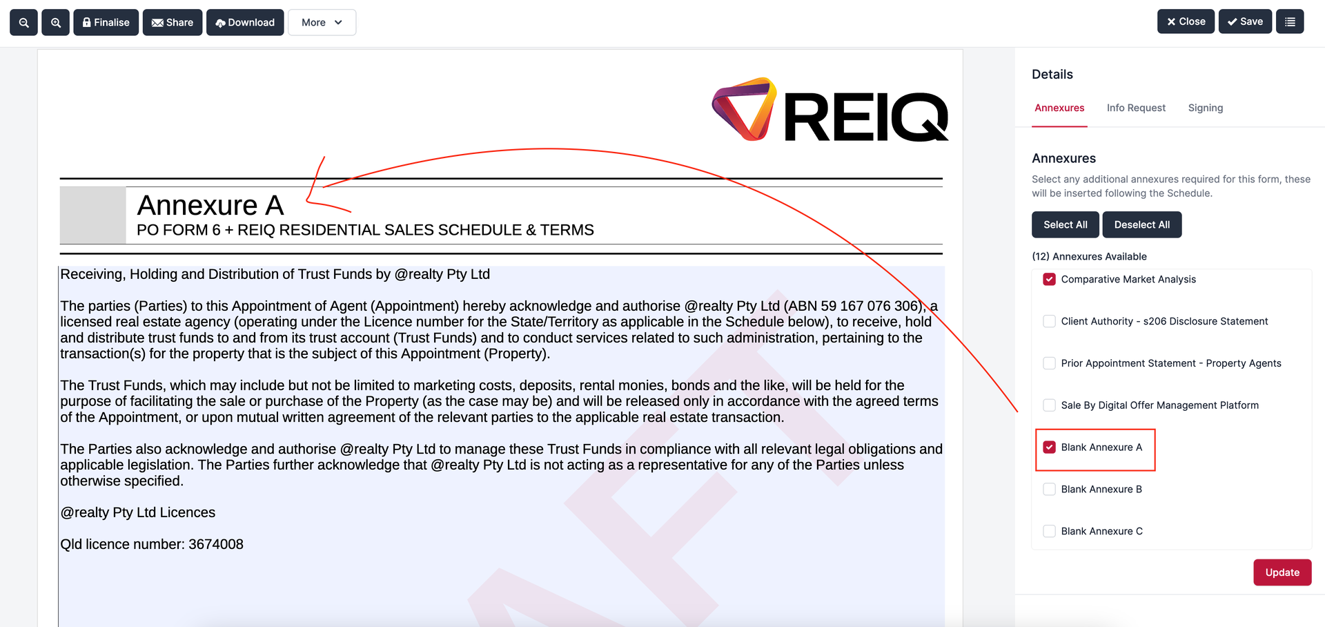 You can add a Blank Annexure to the Form 6 and insert the @realty Trust Account Stakeholder snippet. |