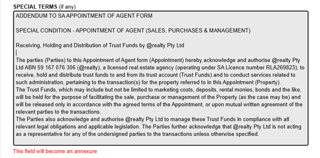 Trust Account Clause: Each Agency Agreement must include the special condition entitled "Receiving, Holding and Distribution of Trust Funds" by @realty Pty Ltd. See below section headed “WHERE DO I ADD THE ADDENDUM TO THE SA APPOINTMENT OF AGENT FORM.
