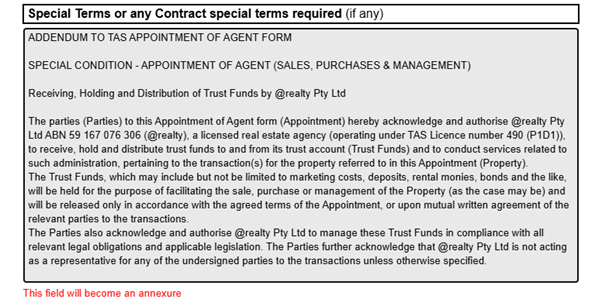 Trust Account Clause: Each Agency Agreement must include the special condition entitled "Receiving, Holding and Distribution of Trust Funds" by @realty Pty Ltd. See below section headed “WHERE DO I ADD THE ADDENDUM TO THE TAS APPOINTMENT OF AGENT FORM.