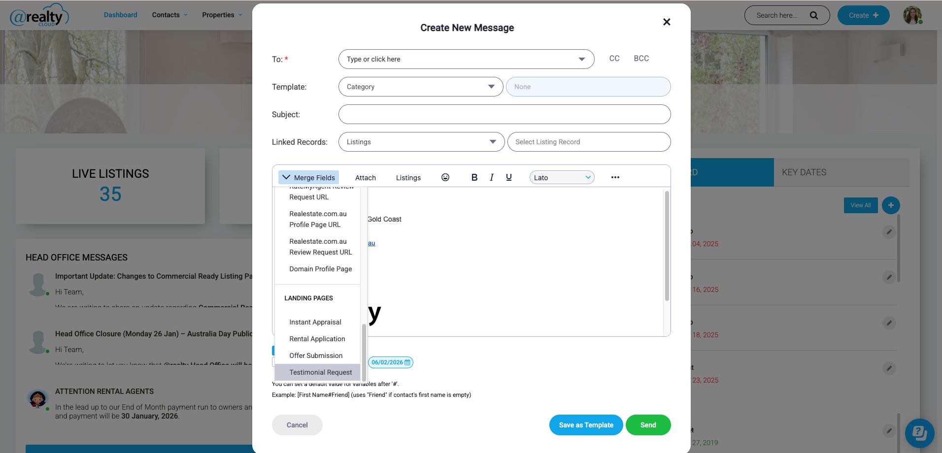 - Email Merge Field - When sending emails from the CRM, use the testimonial link merge field to automatically insert your personal link.