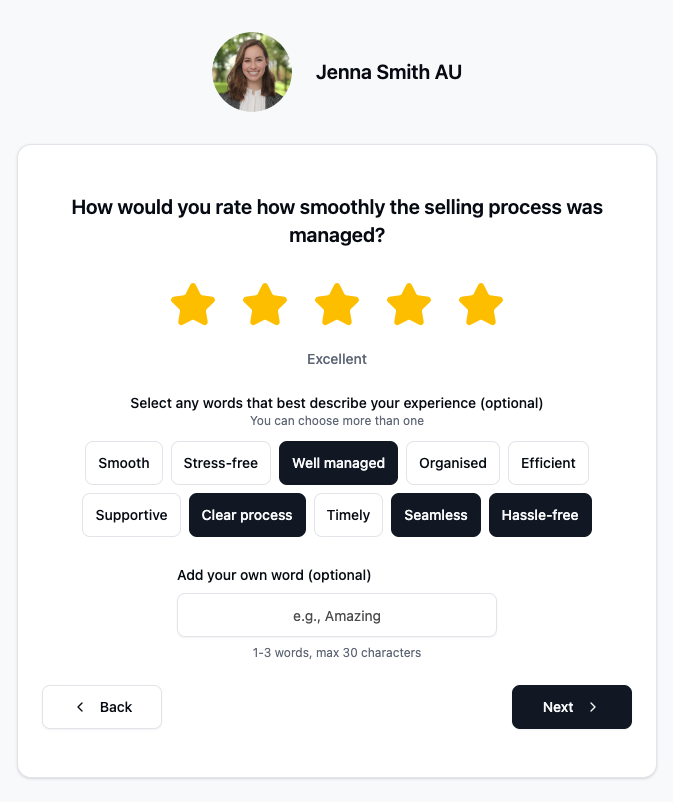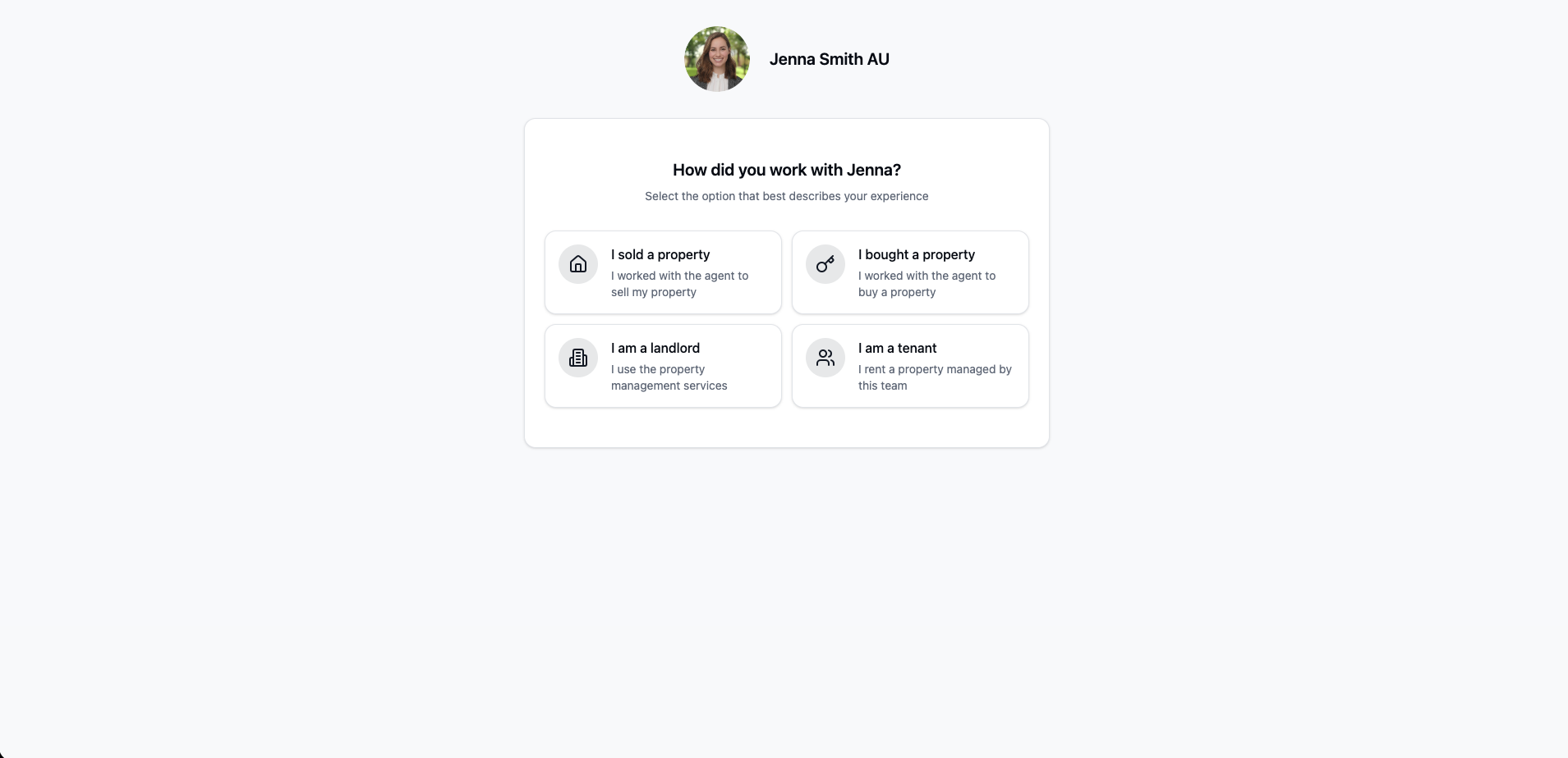 The questions are standardised to ensure consistent, high-quality testimonials. They are tailored based on the client type (seller, buyer, landlord, tenant).