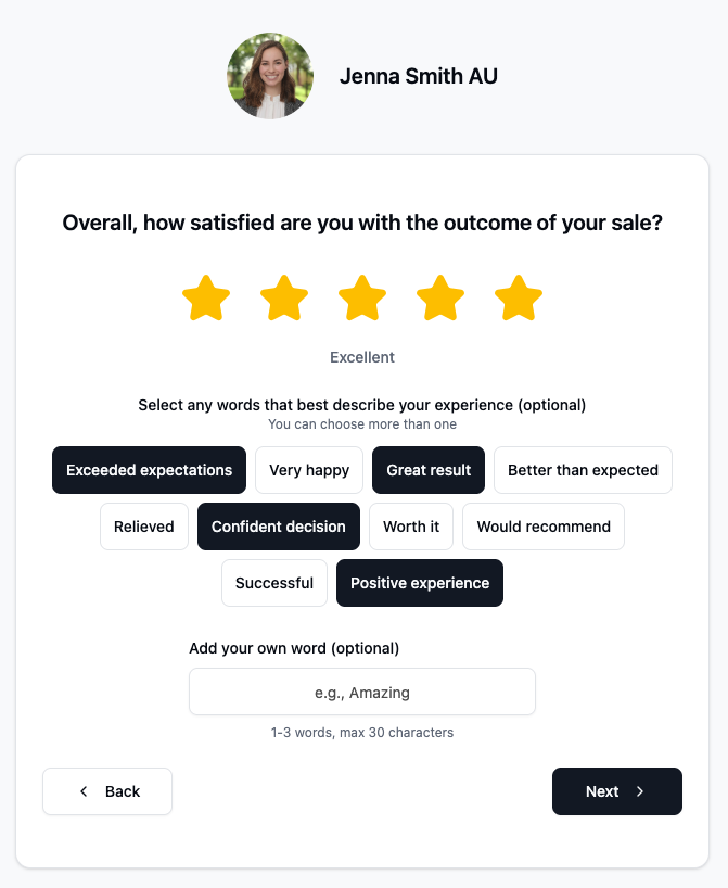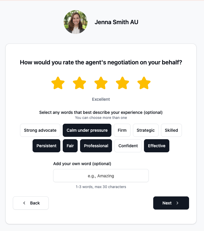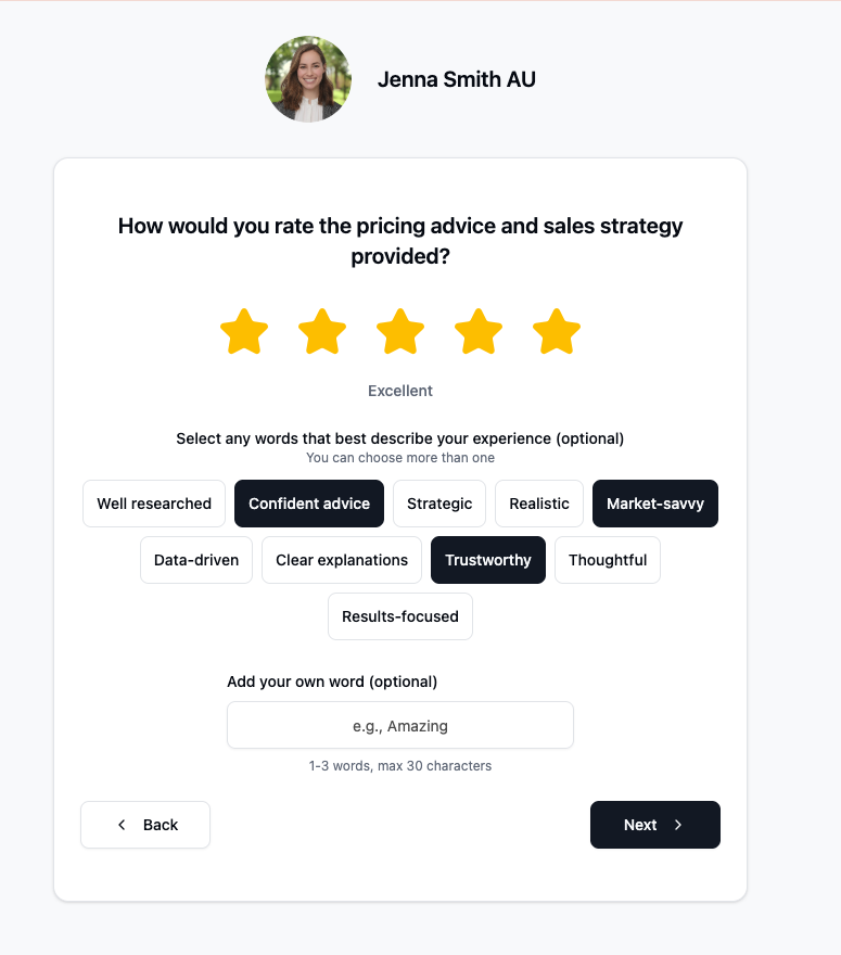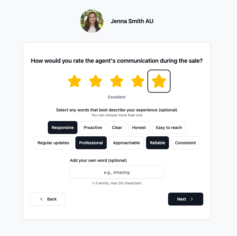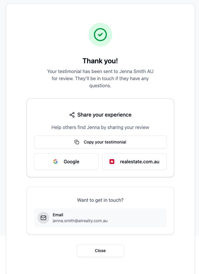 - For high ratings (4-5 stars): Links to also leave reviews on Google, Rate My Agent, and REA