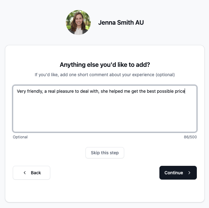 - Optionally select keywords that describe their experience (e.g., "Responsive", "Professional", "Exceeded expectations")