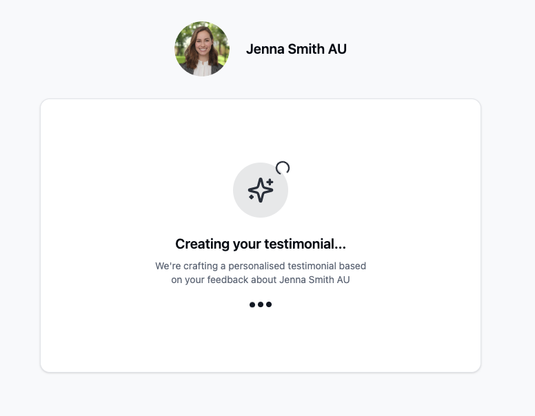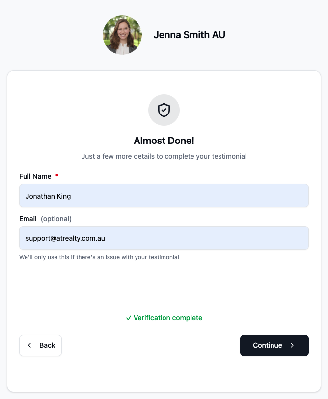 The Testimonial Collection feature allows you to gather professional client reviews through a simple, guided process. Each agent has a unique URL that clients can visit to submit their feedback, which is then transformed into a polished testimonial.