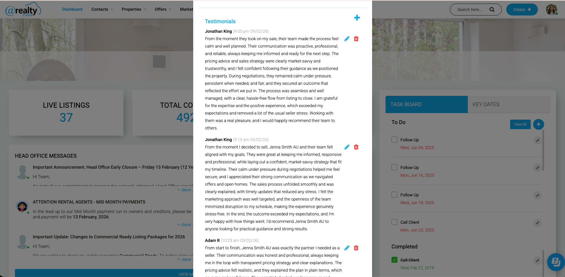 If you have questions about the testimonial feature or need assistance, contact @realty support.