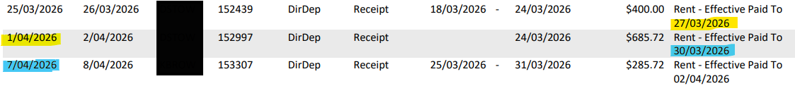 Similarly, (highlighted in blue) you can see the rent was effective paid to 30/03/2026 but the next rent payment wasn't made until 07/04/2026, 8 days after the rent was due.