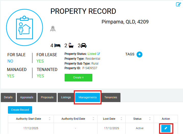 In the Property Record, click 'Managements' > click the pencil icon on the current management record