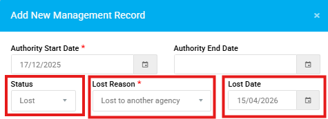 This will notify the HO Rentals Team that the management is being lost from the lost date you enter. Ho Rentals Team will enter this date into Property Tree so rent payments are not receipted past the lost date.